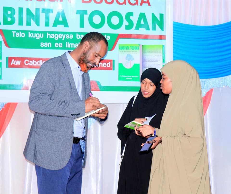Gaba-gabadii munaasabaddaasi ayaa qoraaga dhiganaha Ababinta Toosan Aw Cabdi-qani Xasan Muxamed waxa uu buuggiisa u saxiixay dad badan oo iibsadey iyo qaar uu hadiyad ahaan u siiyay.
