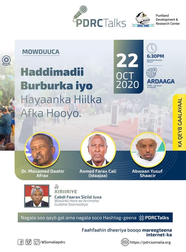 Xalay oo ku beegneyd 22/10/2020-ka waxaa magaalada Garoowe ee Dowlad Goboleedka Puntland lagu qabtay madasha PDRC Talks oo ay soo qaban-qaabisay hay’adda Puntland Development and Research Center (PDRC), waxaana ka soo qayb-galay Xildhibaanno ka tirsan labada Aqal ee BFS, Xildhibaanno heer Dowlad Goboleed, Golaha Wasiirrada Puntland, Akadeemiye-Goboleedka AfSoomaaliga (AGA), Shaqaalaha rayidka ah, ururrada bulshada, naadiyada akhriska iyo qoraalka ee Puntland iyo warbaahinta maxalliga ah.
