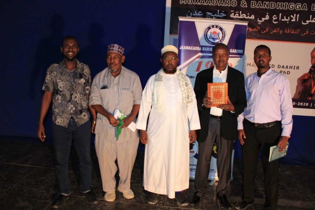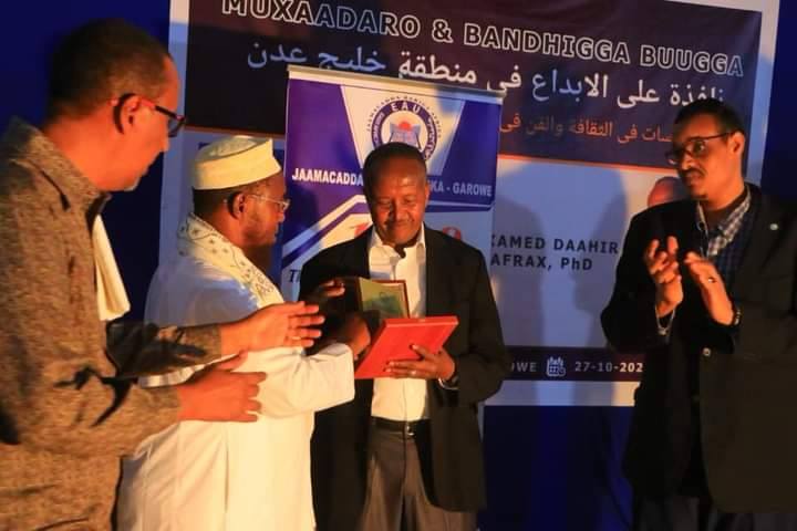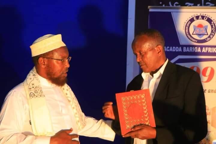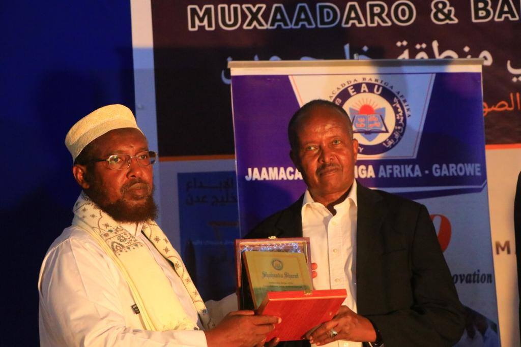 Guddoomiyaha Jaamacadda Bariga Afrika Sheekh Maxamuud Xaaji Yuusuf oo magaca Jaamacadda shahaadadaas ku guddoonsiiyay Guddoomiyaha AGA ayaa ku dheeraaday bogaadinta iyo waxqabadka Dr. Maxamed Daahir Afrax.