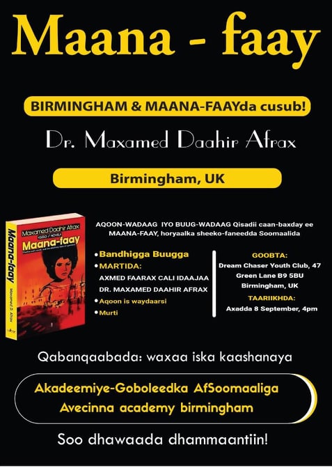 Bandhig aad u weyn oo loogu tala-galay Daah-furka sheekada caanka ah ee Maana-faay, ayna qaban-qaabadeeda iska kaashanayaan Akadeemiye-Goboleedka AfSoomaaliga (AGA) iyo Avecinna Academy Birmingham ayaa lagu wadaa maalinta Axadda ah oo ku beegan 8/9/2019 in lagu qabto magaalada Birmingham ee wadanka Ingiriiska.