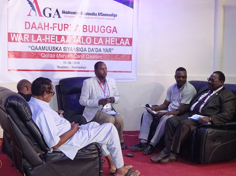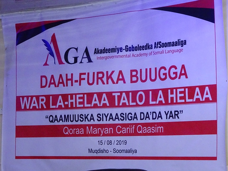 Munaasabad aad u ballaaran oo ay soo qaban-qaabisay Akadeemiye-Goboleedka AfSoomaaliga (AGA), looguna tala-galay Daah-furka buugga War Helaa – Tala Hela ee Qaamuuska Siyaasiga Da’da yar, ayna ka soo qeyb galeen Xildhibaanno, Abwaanno, Qorayaal, Fannaaniin, ehelada afka, dhaqanka iyo hal-abuurka, Saxafiyiin iyo dhallinyarada danaysa akhriska iyo qoraalka ayaa maanta oo ku beegan 15/8/2019 waxaa lagu qabtay magaalada Muqdisho.